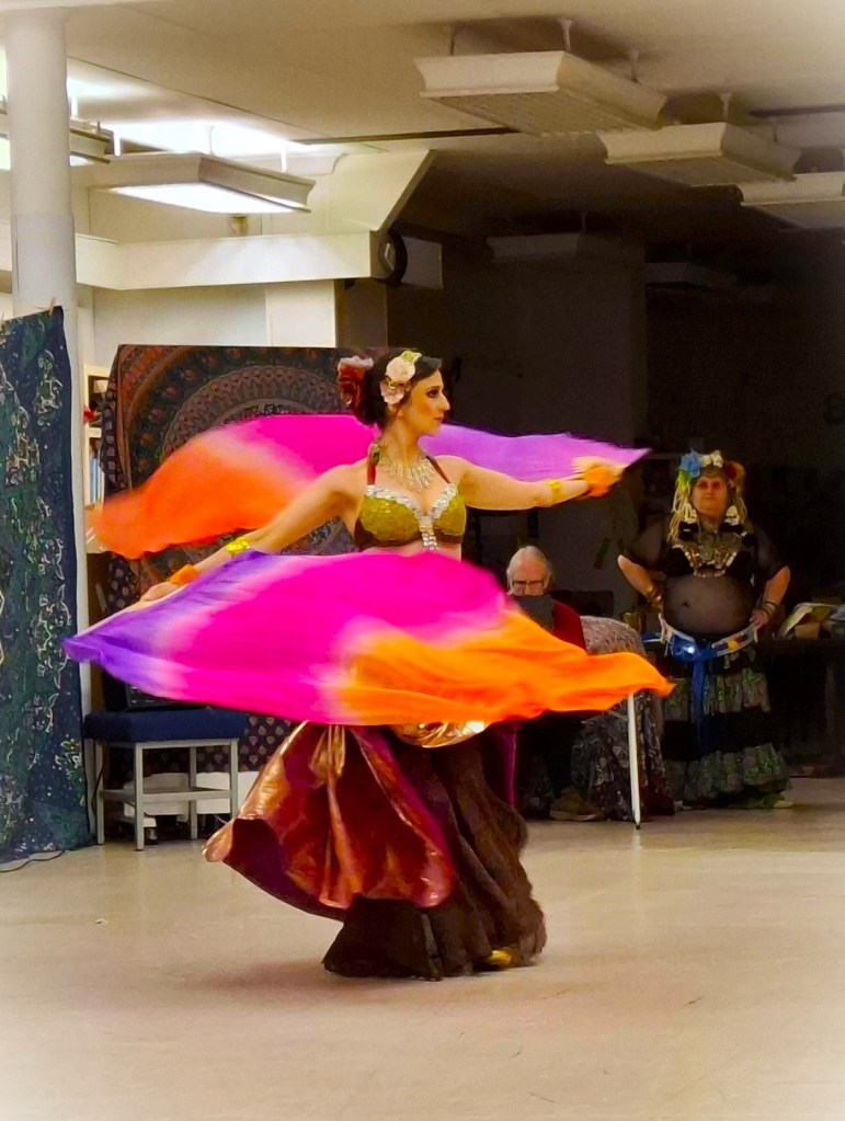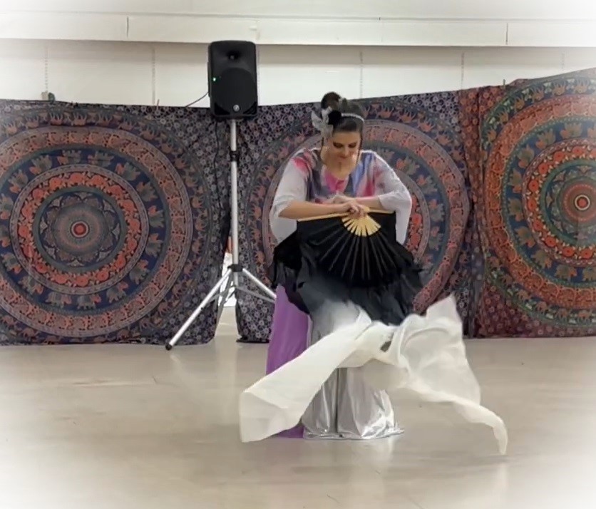 Taster workshops, corporate energisers, team building, hen/ mehndi parties, ice-breakers, wellbeing, WI (Women’s Institute), cultural events, ladies only parties, women’s refuges and more – Meilyn taught workshops to newcomers, who could try out bellydance and shimmy in a coinbelt!